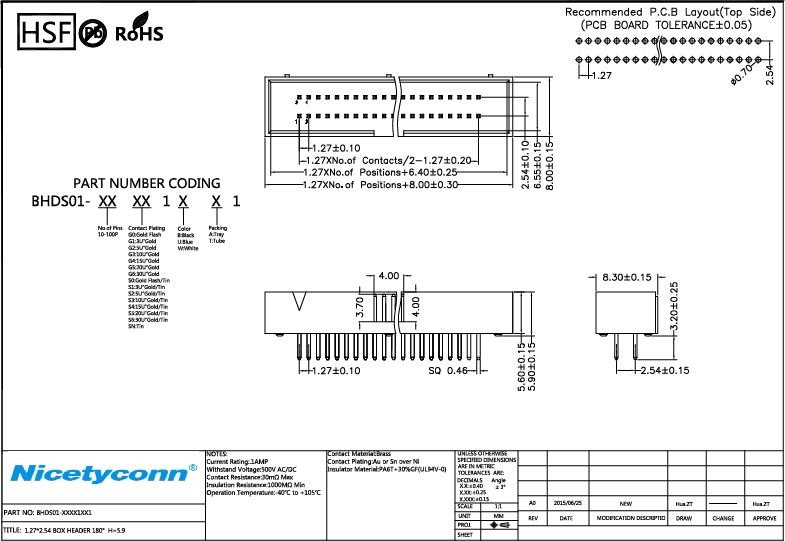 1.27*2.54 mm Pitch 180 Degree Box Header Plug